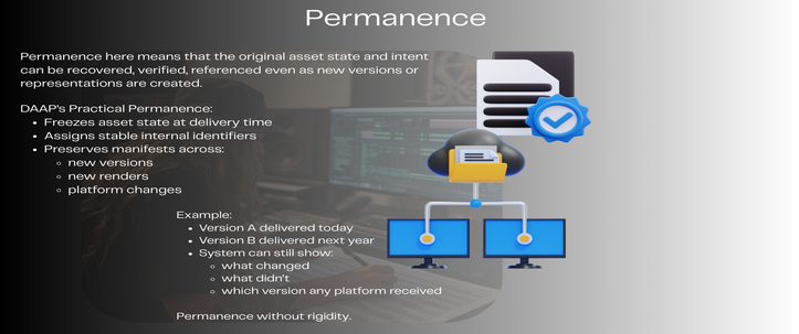 DAAP preserves the work as a composite digital object with internal structure, contributor context, and verifiable authorship upstream. This structured definition enables downstream environments to recognize, respect, and build upon the full creative and technical contributions involved in the work, including tool‑level participation