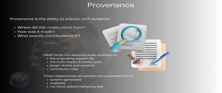 DAAP defines digital audio as an asset‑level topology, not a file format. It treats a musical work as a structured, session‑derived container whose identity, attribution, and provenance are established at the moment of asset formation. In this model, the work is not reduced to a flattened audio file; it is preserved as a composite digital object with internal structure, context, and verifiable authorship.